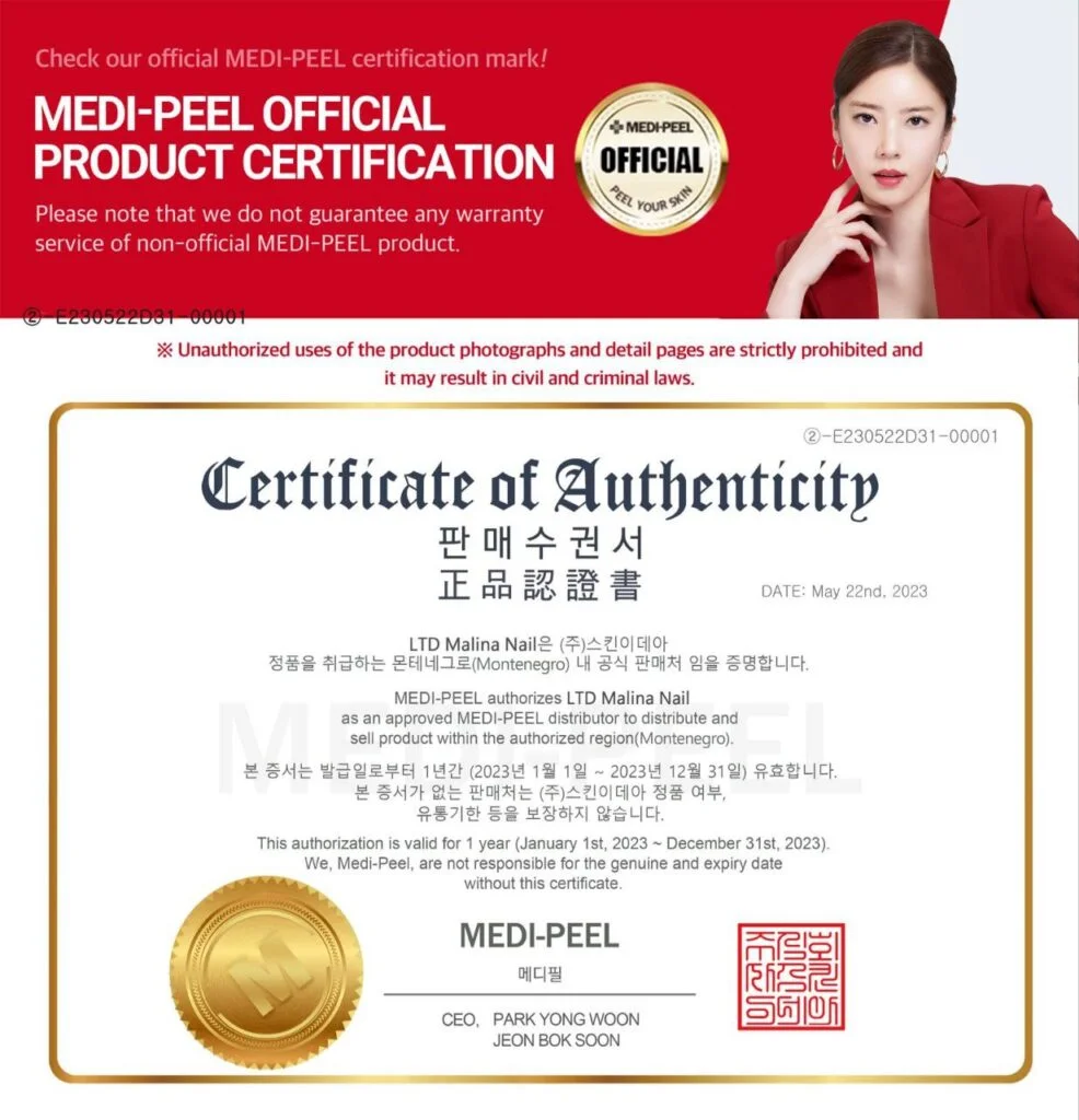 Ekskluzivni smo zastupnici korejskog premium brenda Medi-Peel za Srbiju i Crnu Goru. U našoj online prodavnici možete pronaći originalne Medi-Peel proizvode uz dostavu na teritoriji obe zemlje. Sve proizvode nabavljamo direktno od proizvođača i svaki poseduje sertifikate kvaliteta.